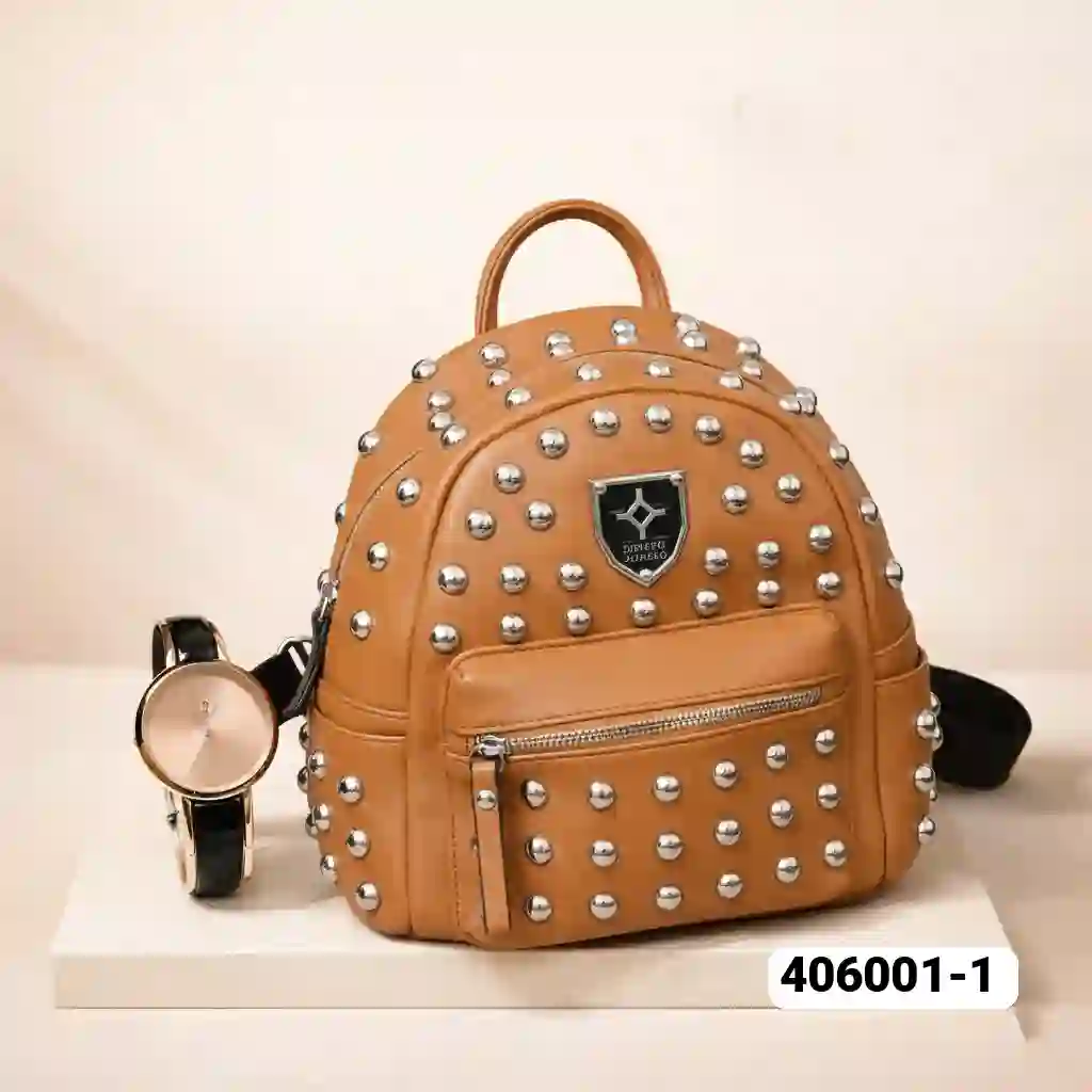 "طقم الفخامة حقيبة ظهر مع ساعة نسائية بتصميم سوار صلب بالون الذهبي الوردي