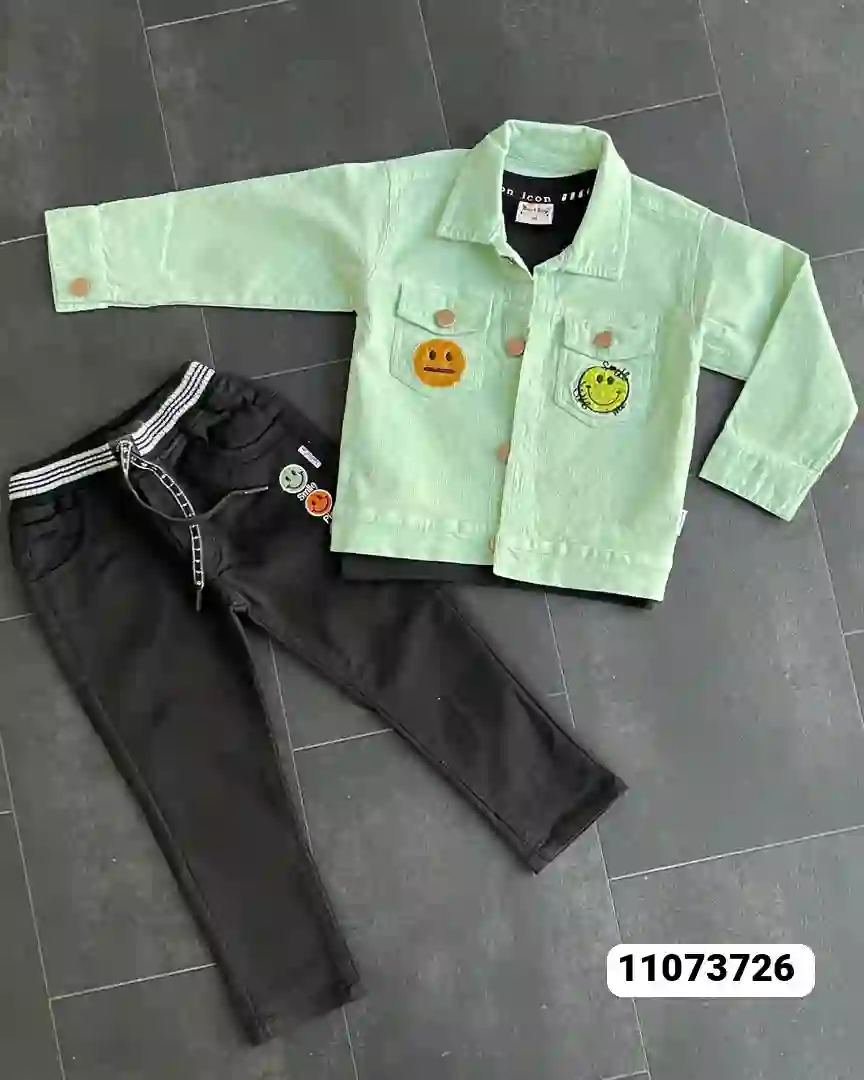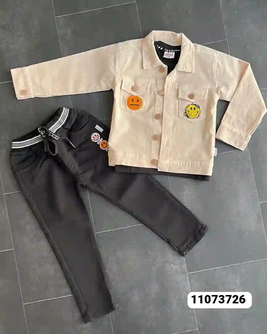 يتكون من جاكيت جينز مزين برسومات وجوه تعبيرية مطرزة تضيف لمسة مرحة،