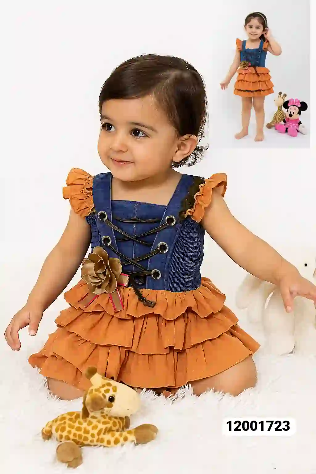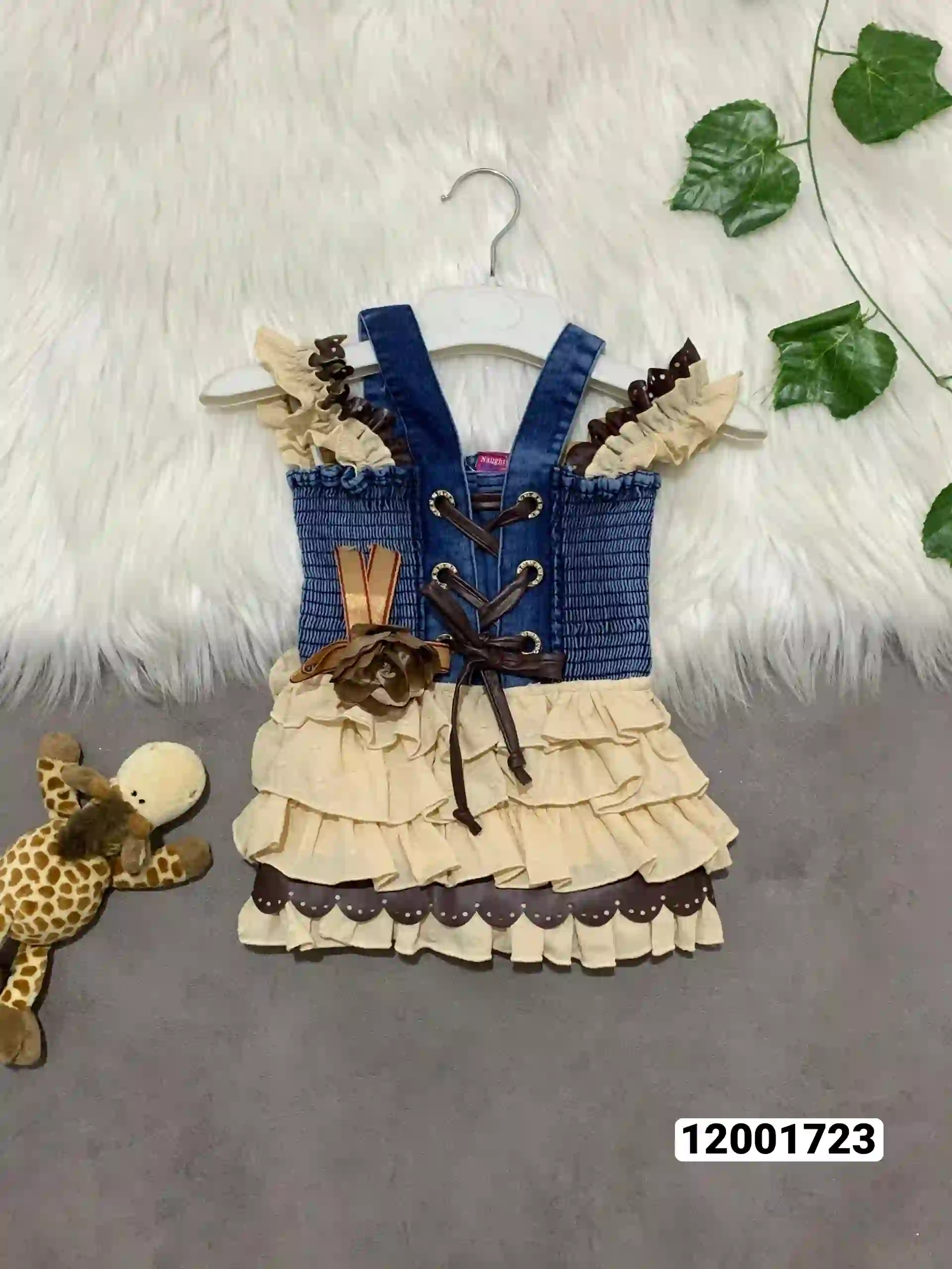 فستان بناتي صدر علاقي جينز مطاط طبقات الفوطه