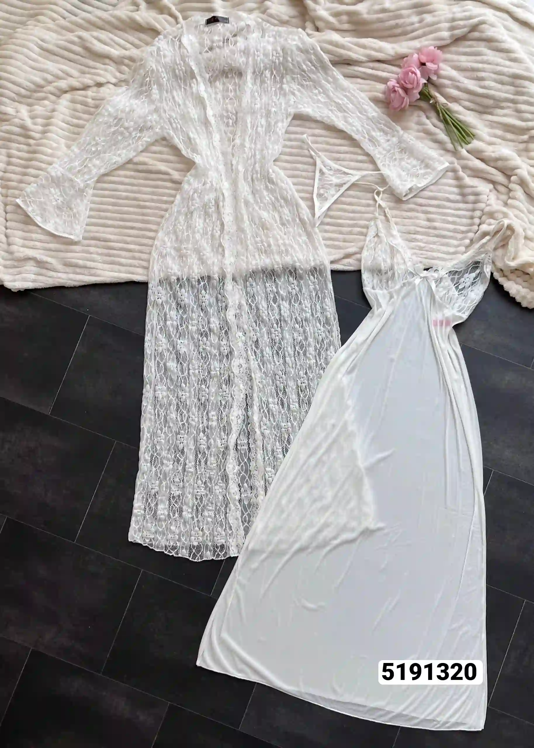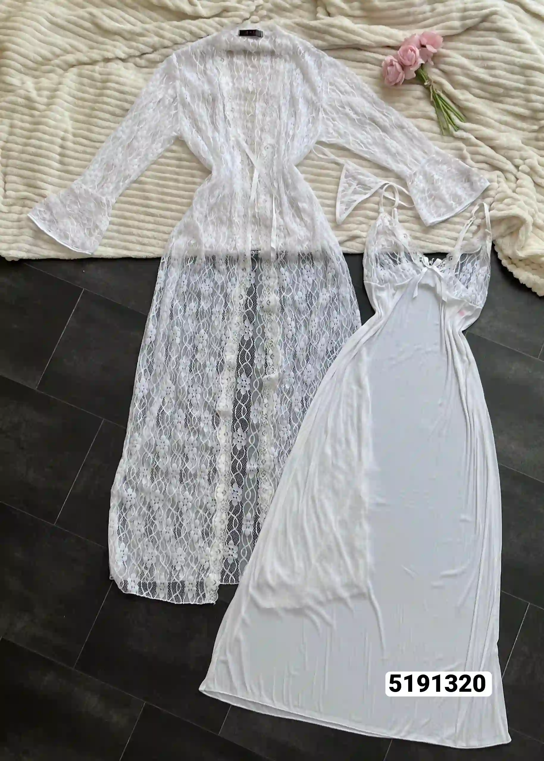 روب نوم حريري ابيض ناعم، طويل فضفاض ينسدل بأناقة،