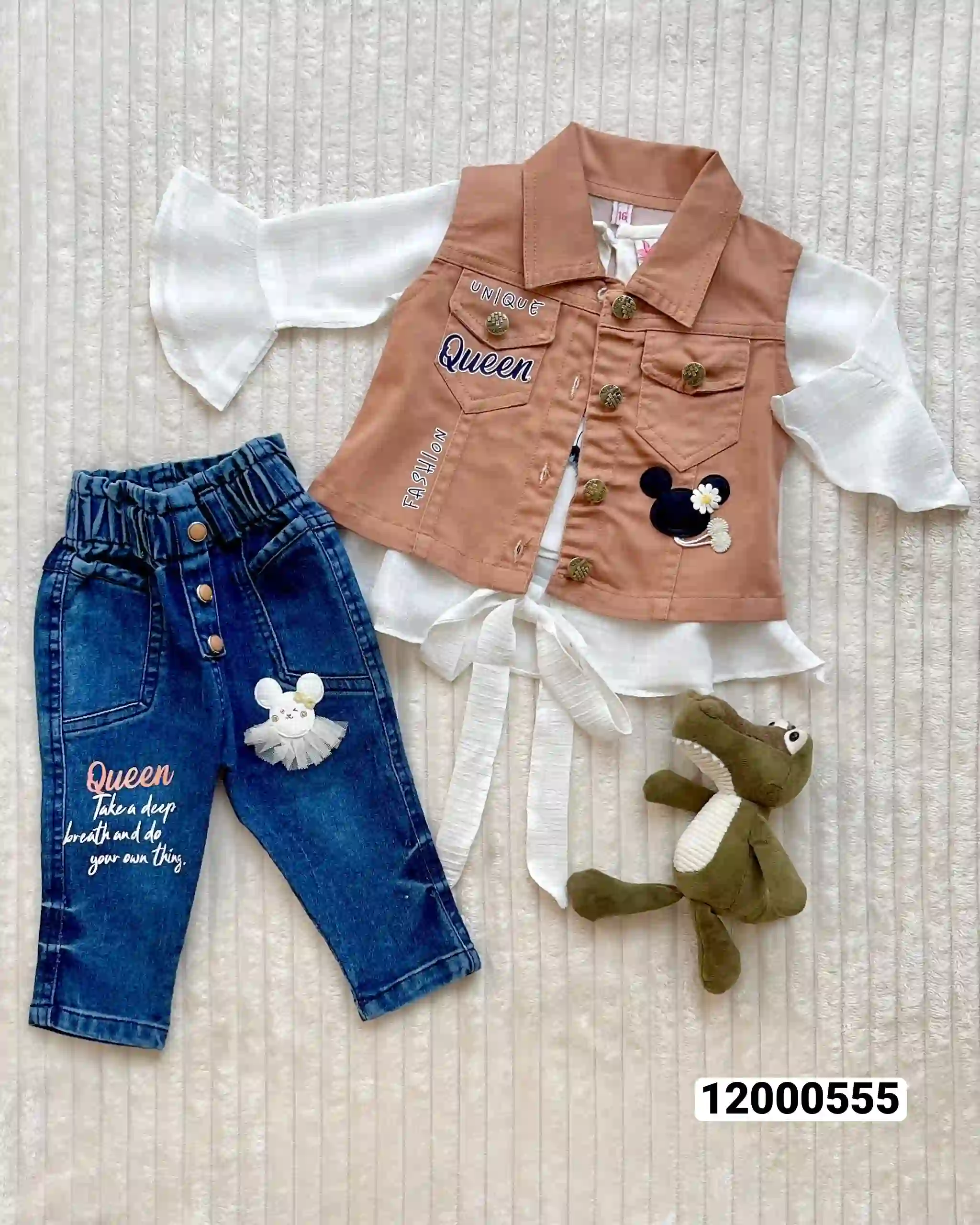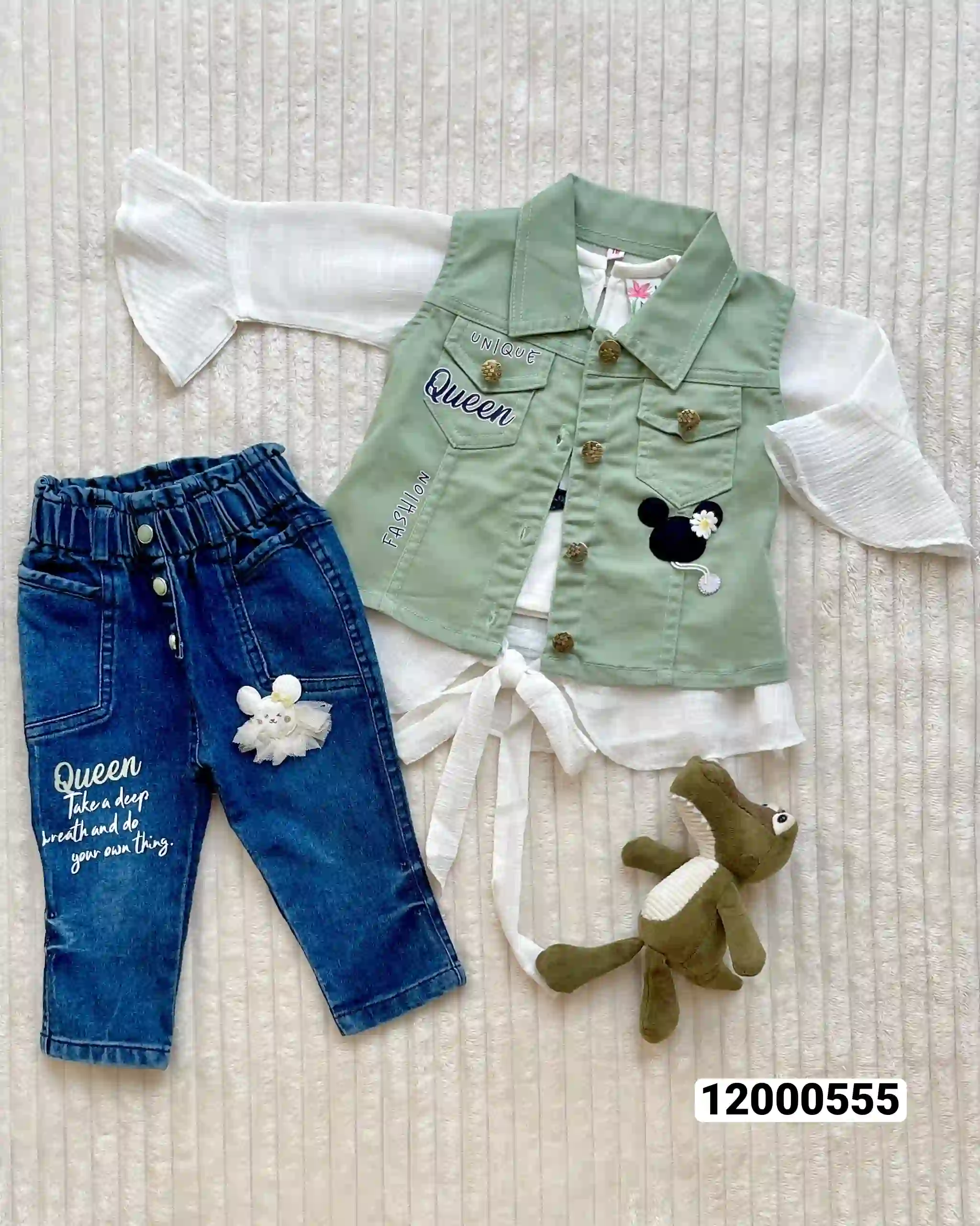 طقم بناتي بنطلون جينز شمير شيفون يلاق كتان