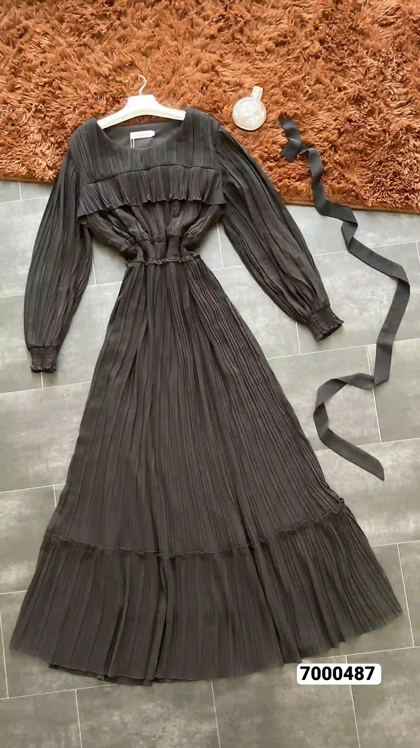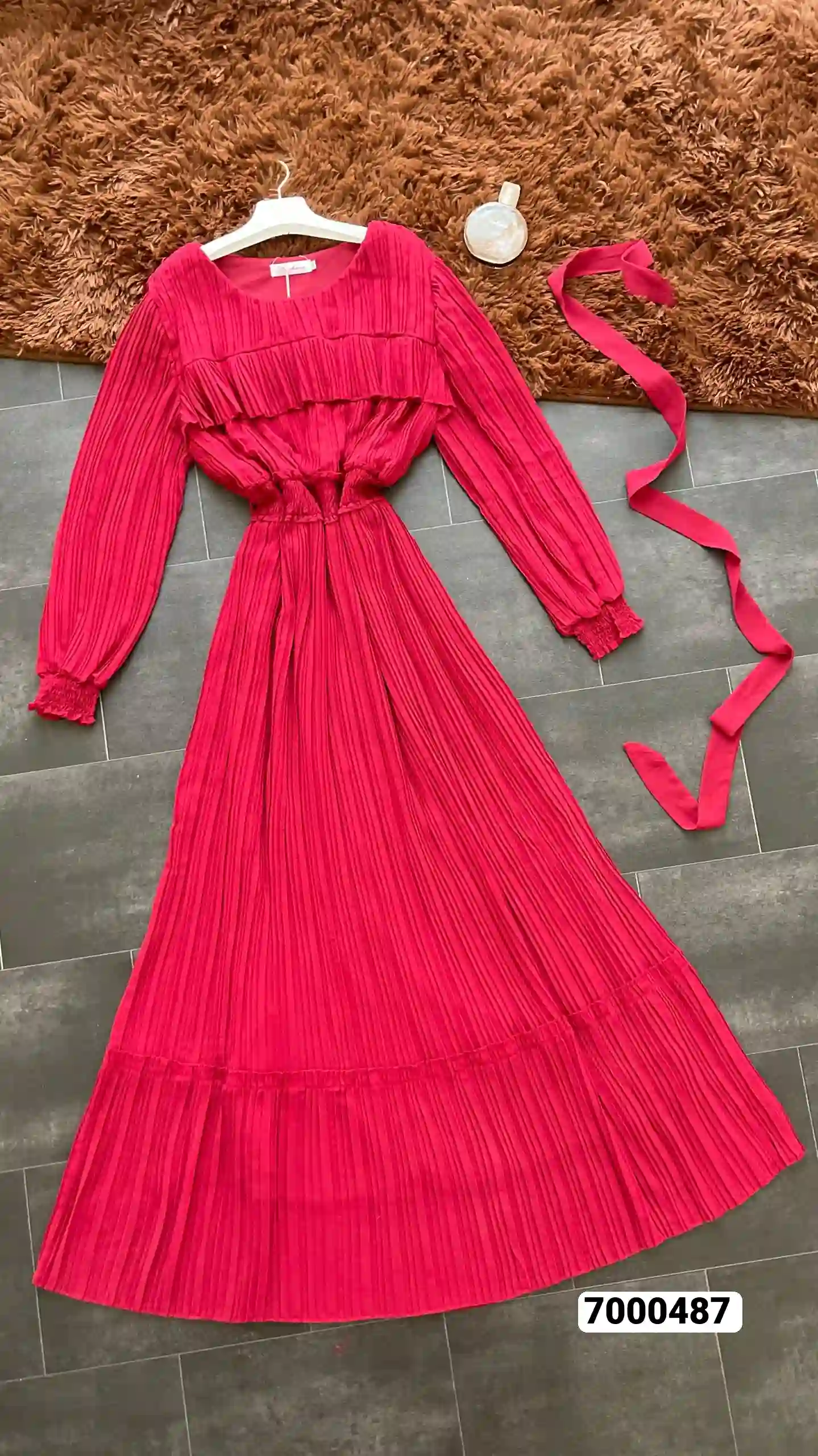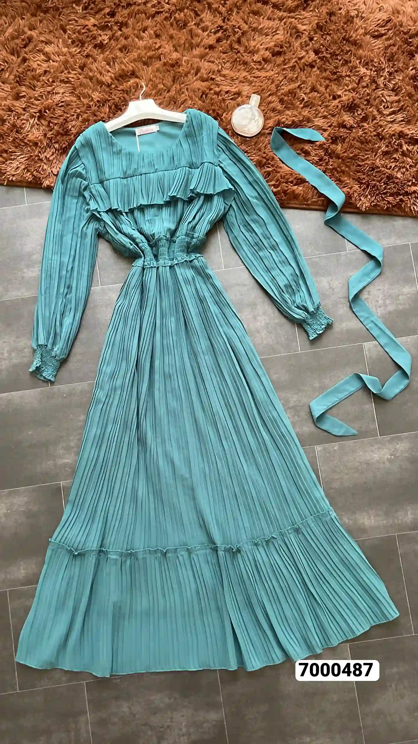 تصميم فاخر بكسرات ناعمة تضيف لمسة فخامة لكل حركة * خامة شيفون خفيفة وناعمة على البشرة، مع بطانة داخلية لضمان الراحة والثقة * خصر مطاطي بلمسة أنثوية تبرز القوام برقي * أكمام طويلة بكشكشة أنيقة ومعصم مطاطي