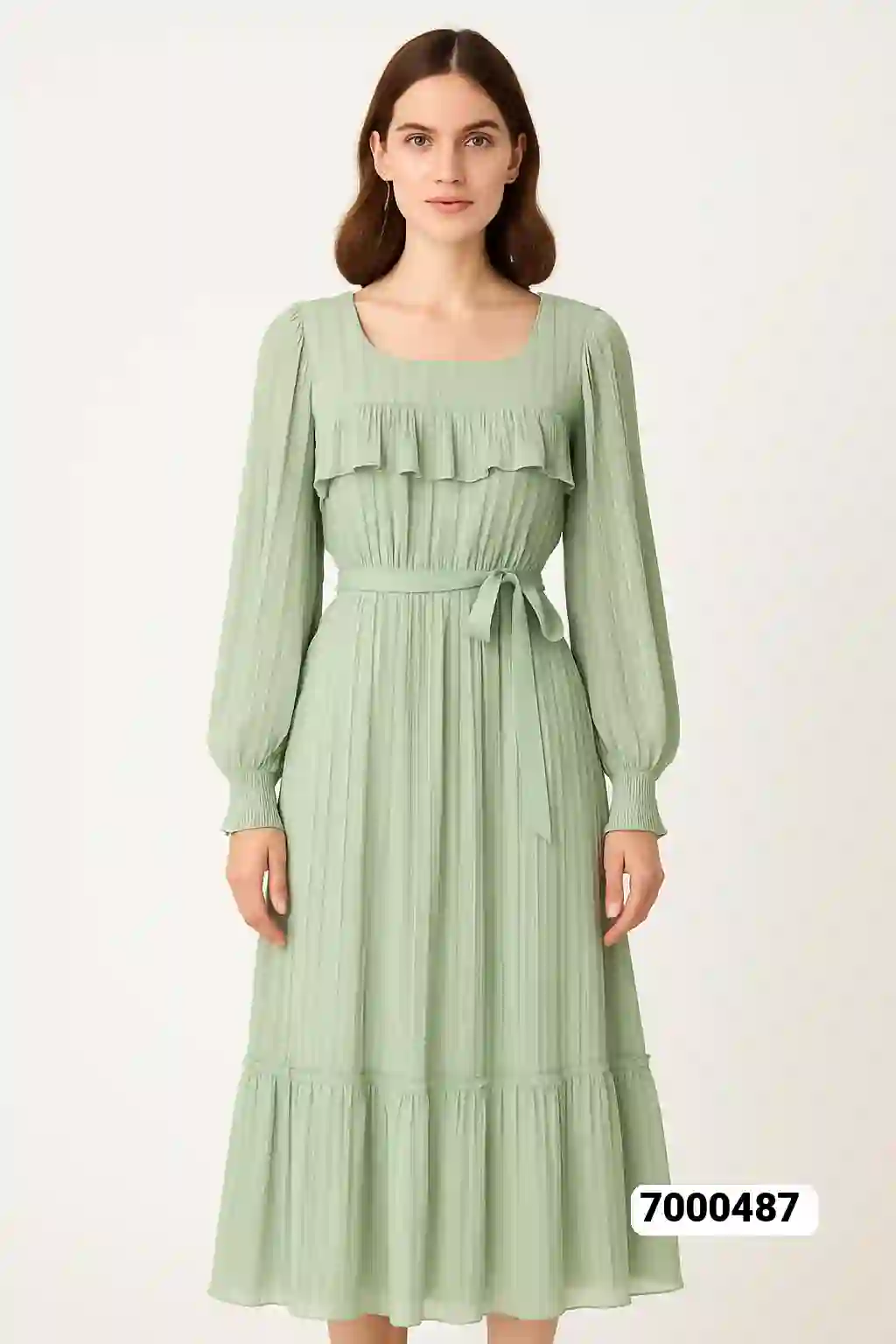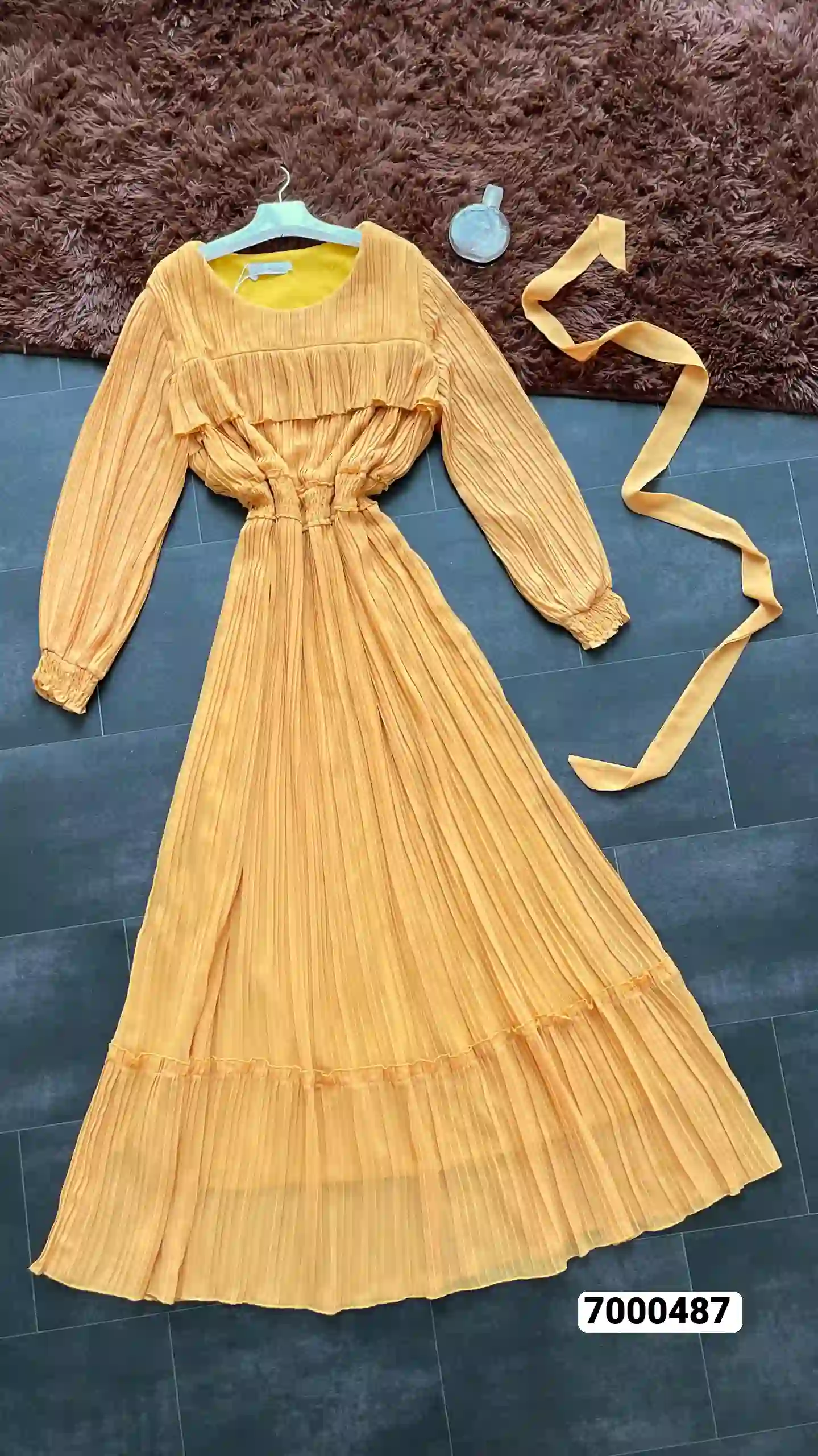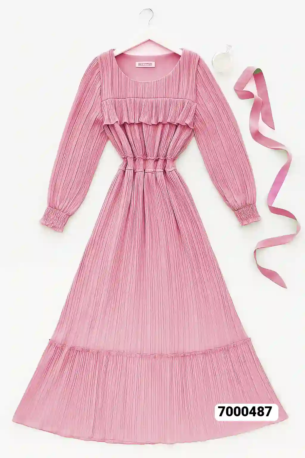 تصميم فاخر بكسرات ناعمة تضيف لمسة فخامة لكل حركة * خامة شيفون خفيفة وناعمة على البشرة، مع بطانة داخلية لضمان الراحة والثقة * خصر مطاطي بلمسة أنثوية تبرز القوام برقي * أكمام طويلة بكشكشة أنيقة ومعصم مطاطي