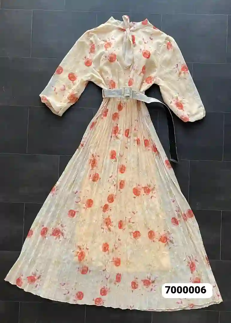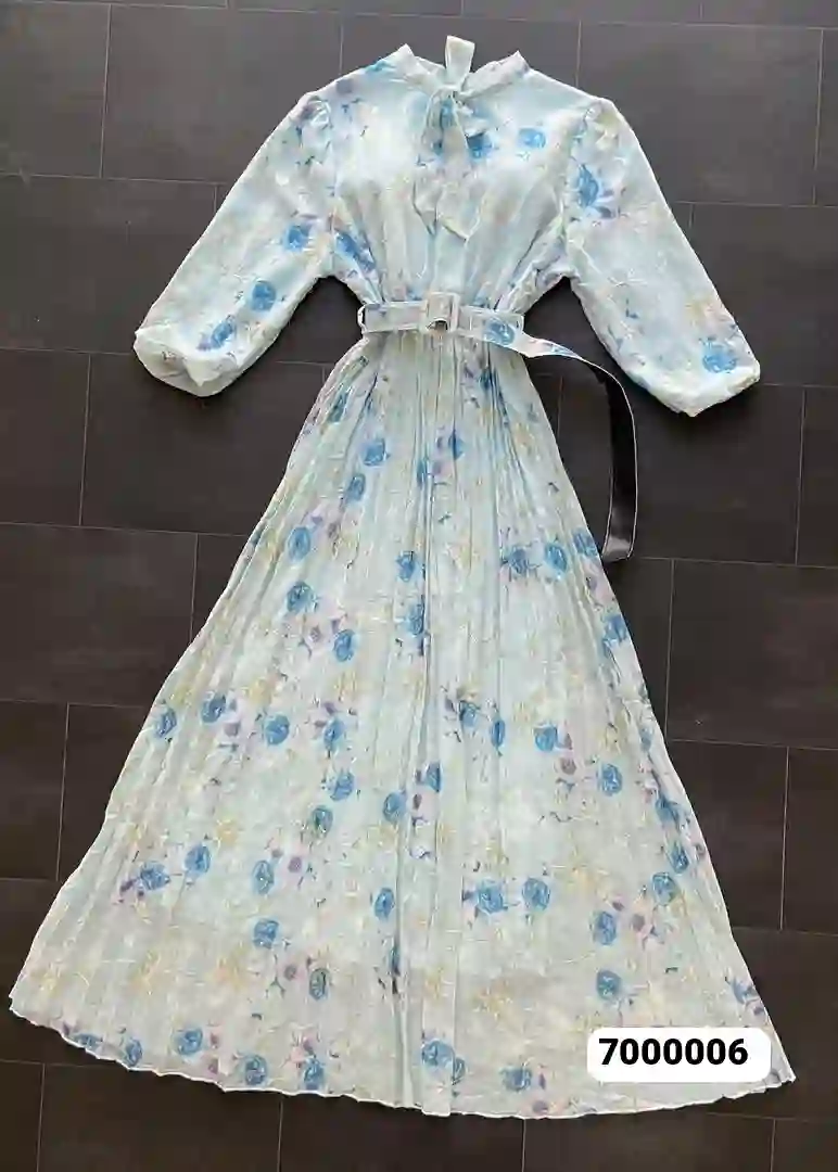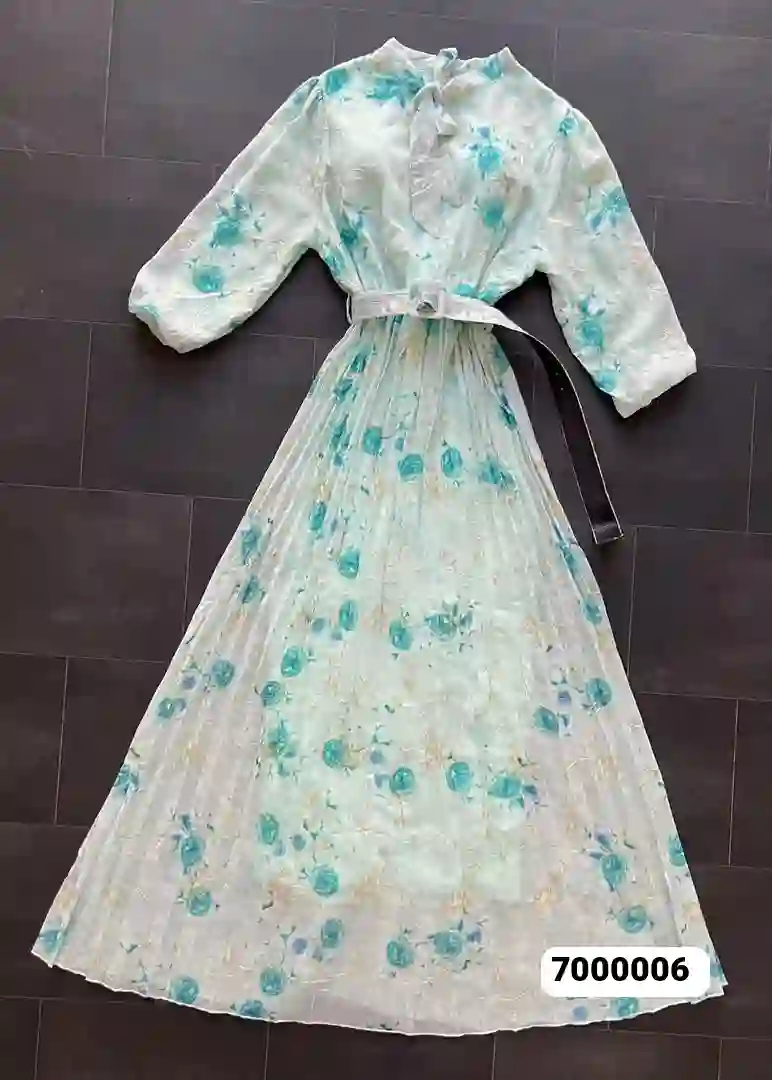فستان الطويل المصنوع من الشيفون الفاخر، بتصميم تركي أنيق يناسب جميع المناسبات. يتميز بقصة انسيابية ناعمة، ونقشة زهرية جذابة تضفي لمسة من الرقي والأنوثة. مزود بحزام خصر بنفس النقشة لتحديد القوام وإبراز جمال الإطلالة.