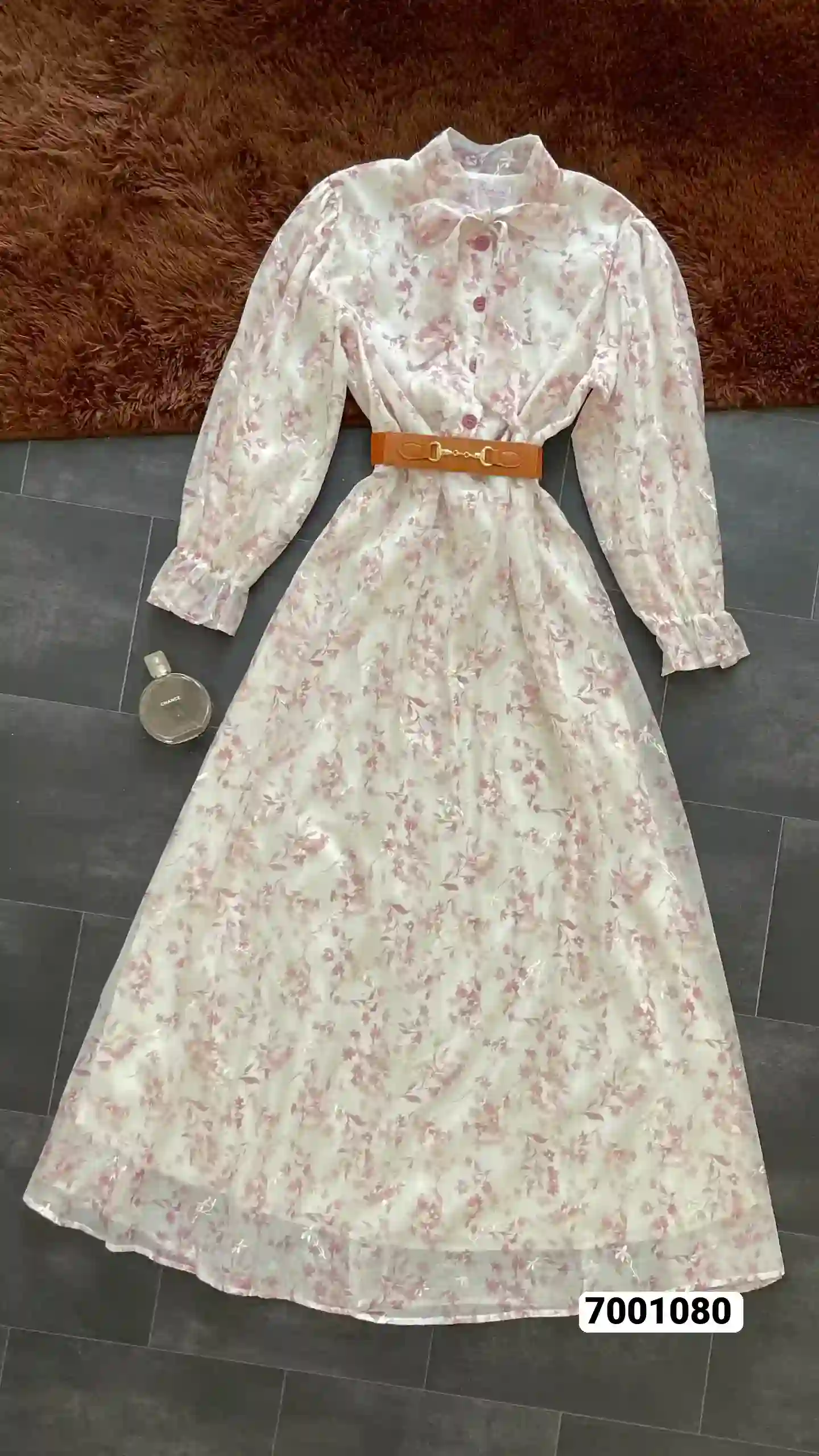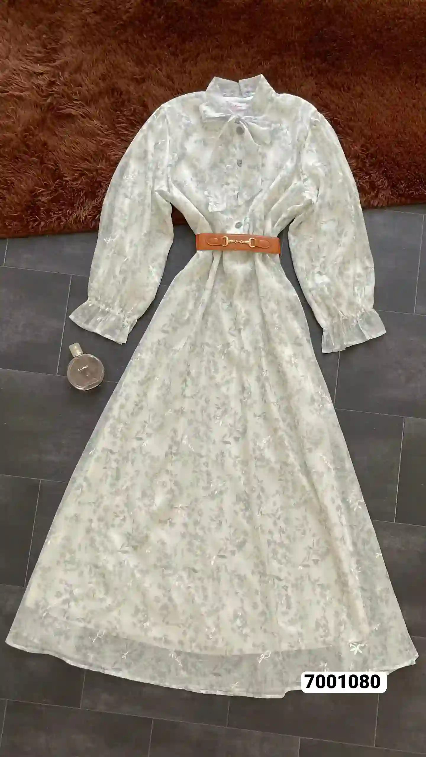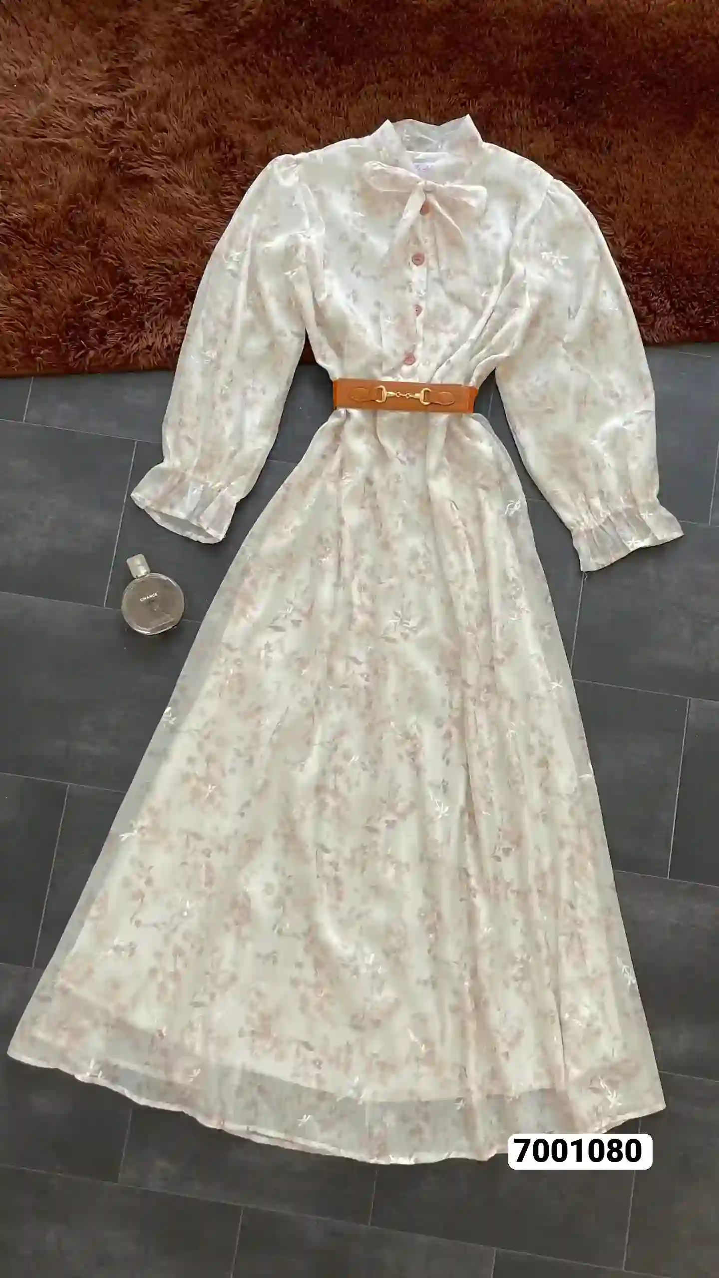 تفاصيل إضافية: أزرار أمامية، حزام بلون بني، أكمام بكم منفوخ وكشكشة