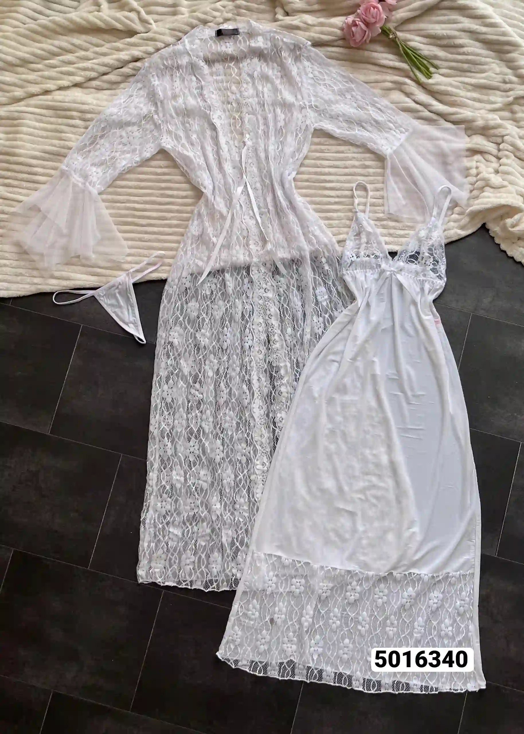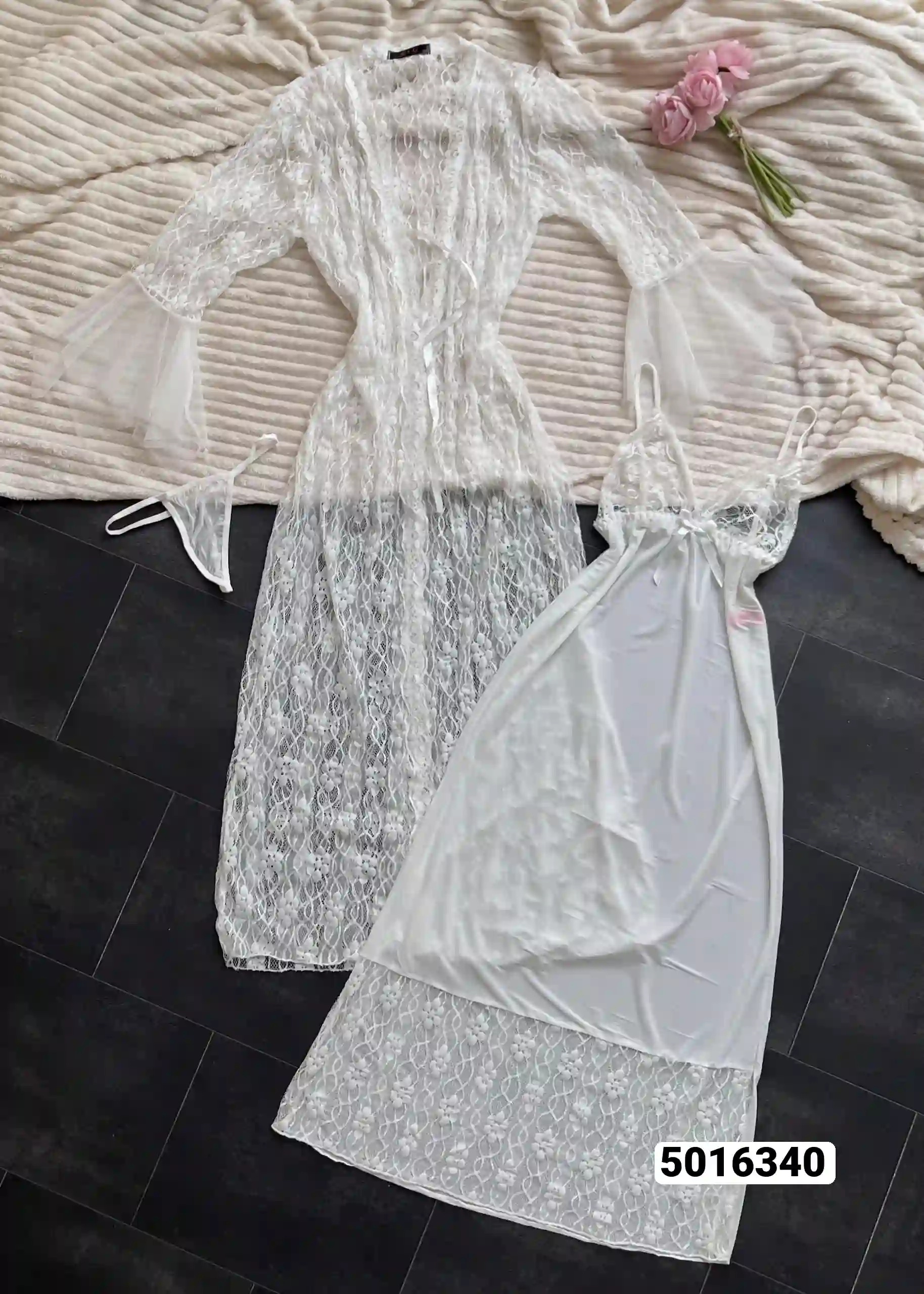 . مصنوع من الدانتيل الأبيض والسكري الناعم والشفاف، فضفاض مثاليًا للاسترخاء في المنزل أو كغطاء رومانسي.