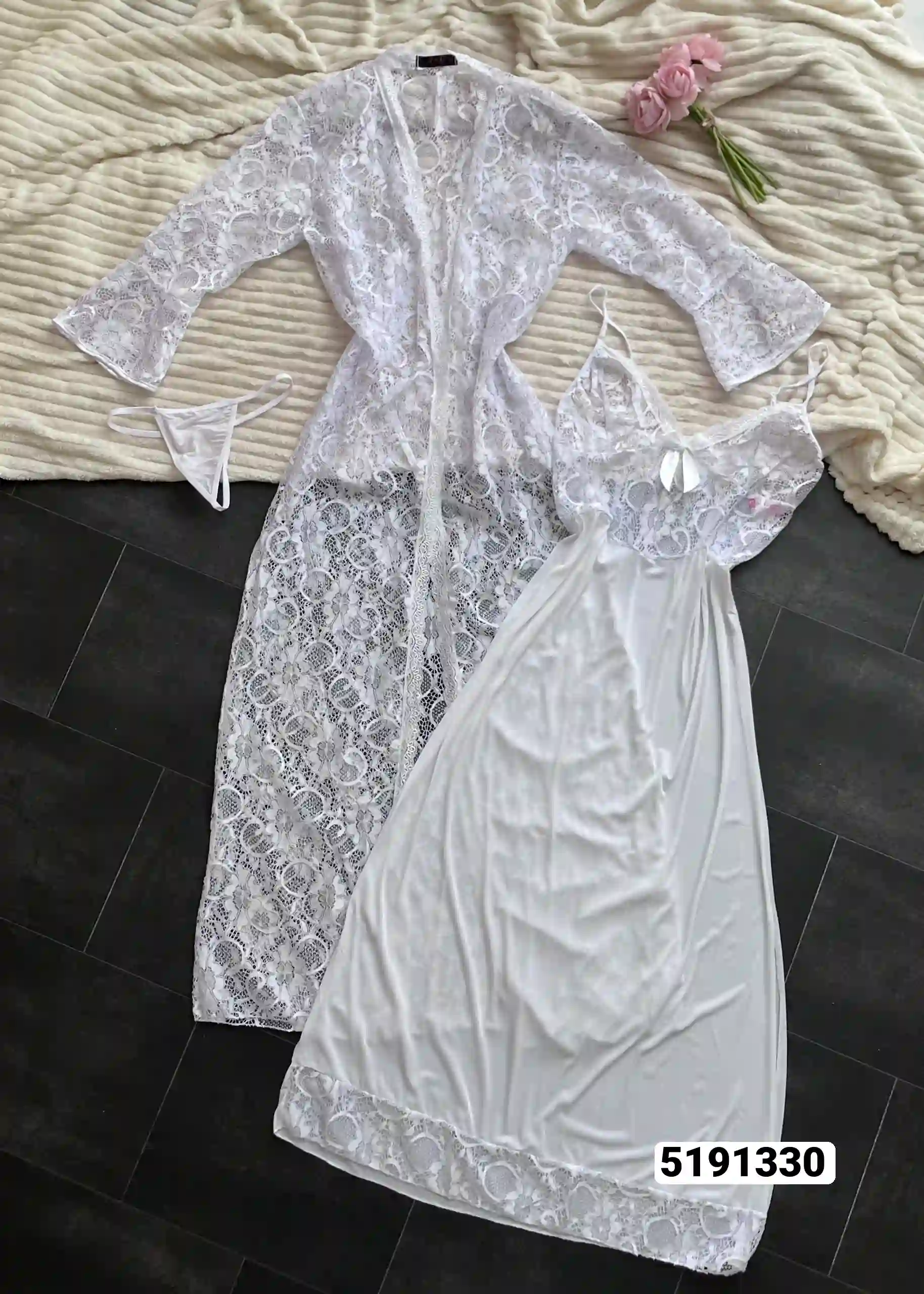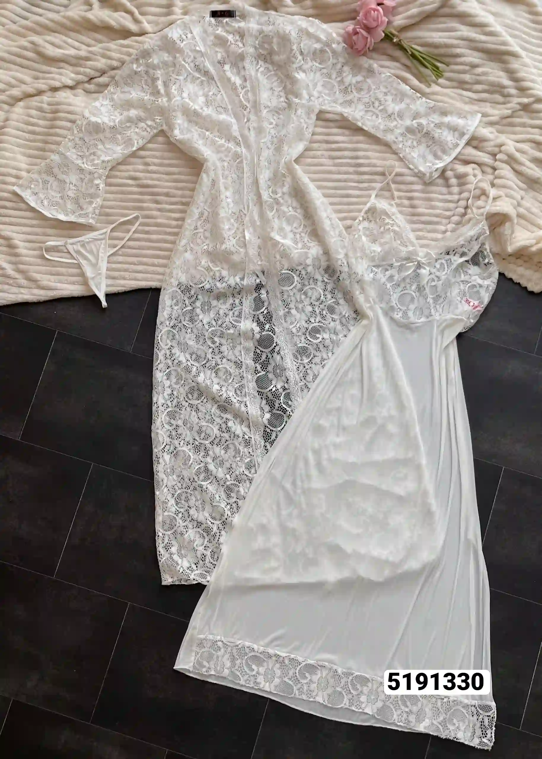 * لون: أبيض ناصع * التصميم: دانتيل رقيق وشفاف * القصة: فضفاضة ومريحة مع حزام قابل للربط * الأكمام: طويلة