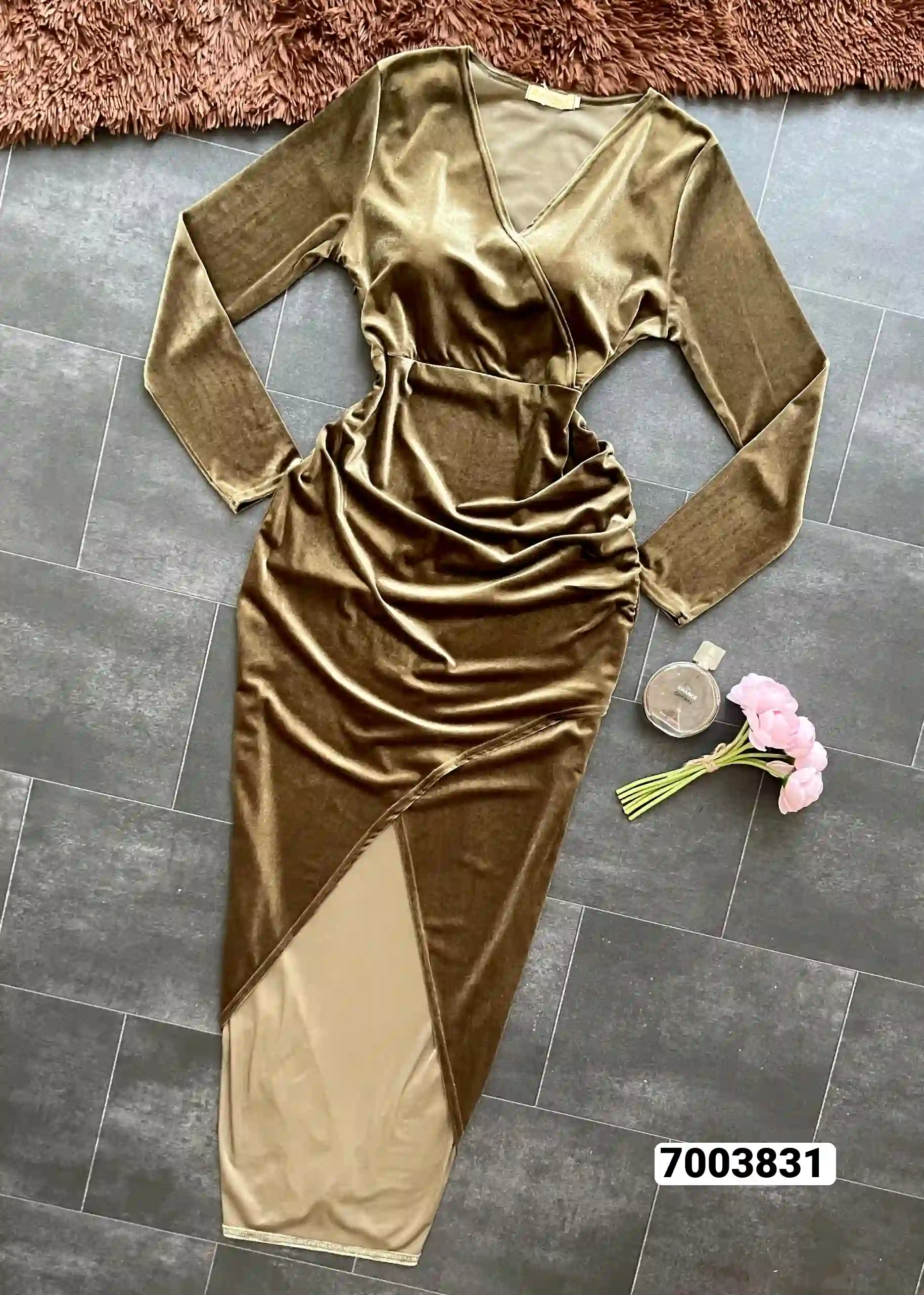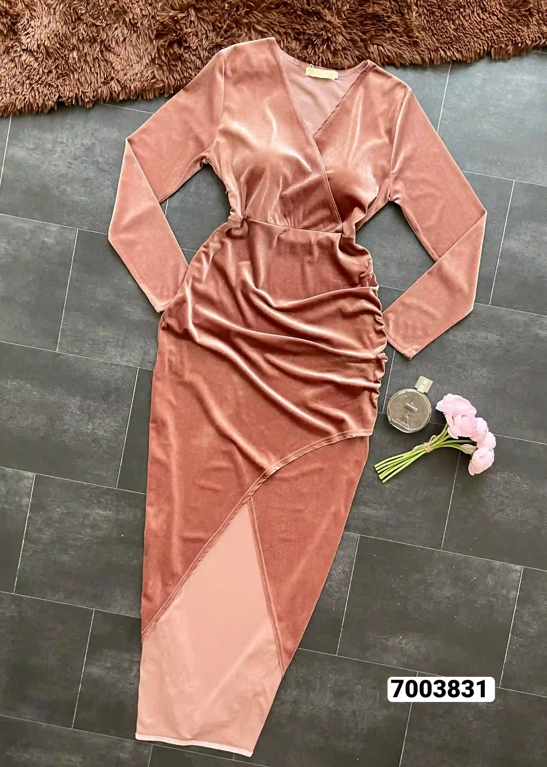 يتميز بتصميم لف أمامي (كروس) مع فتحة رقبة على شكل حرف V تضيف لمسة أنثوية راقية. يأتي بأكمام طويلة وقصة ضيقة تبرز القوام،