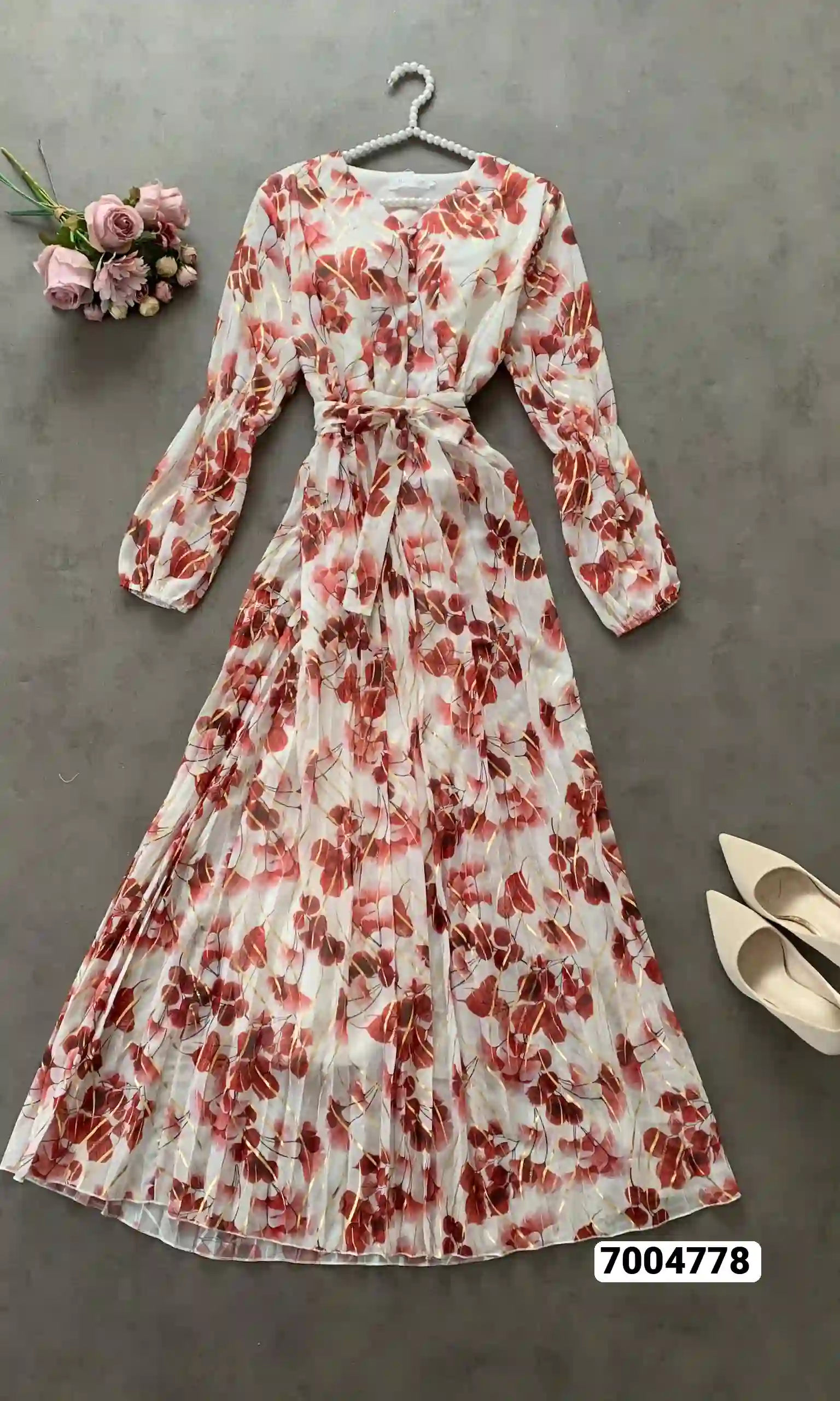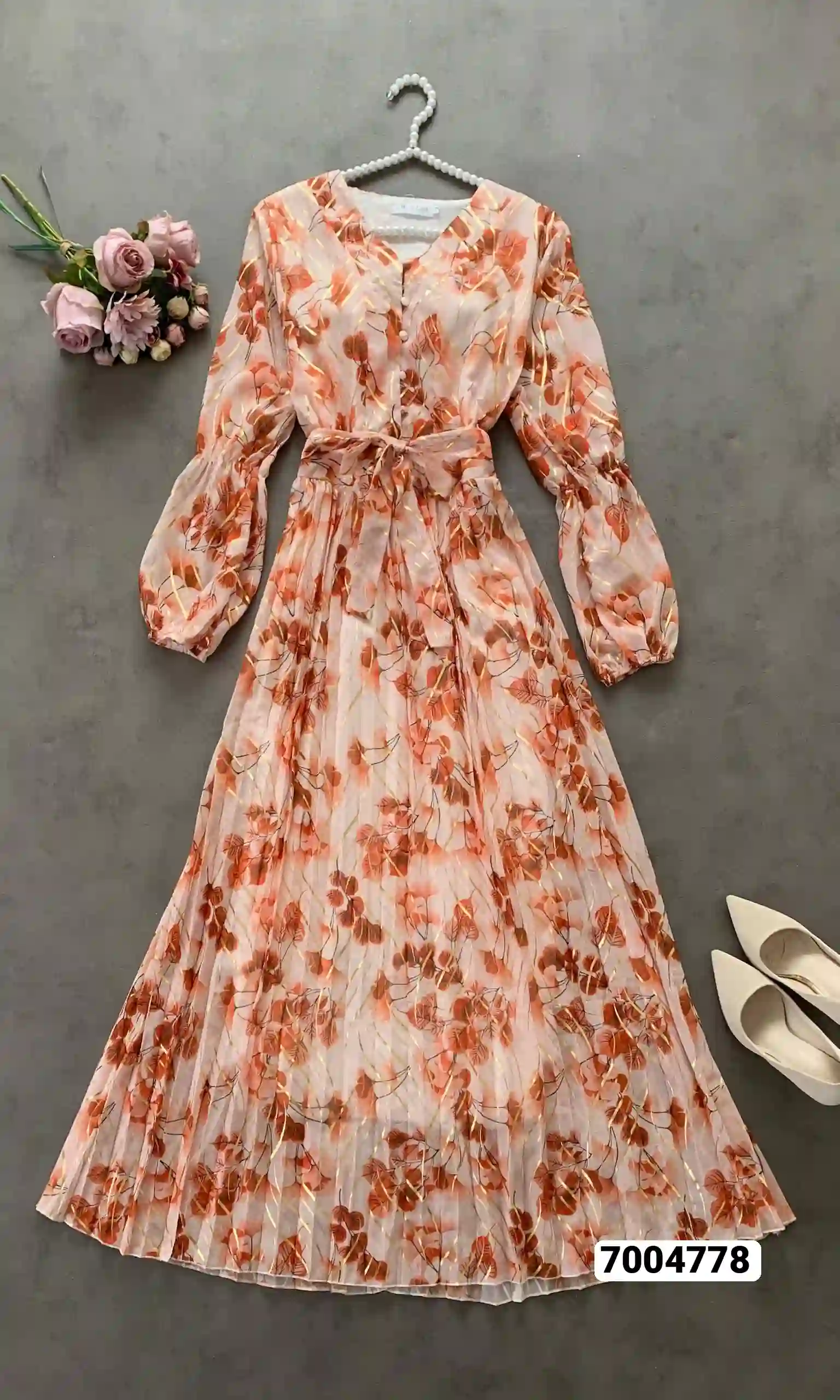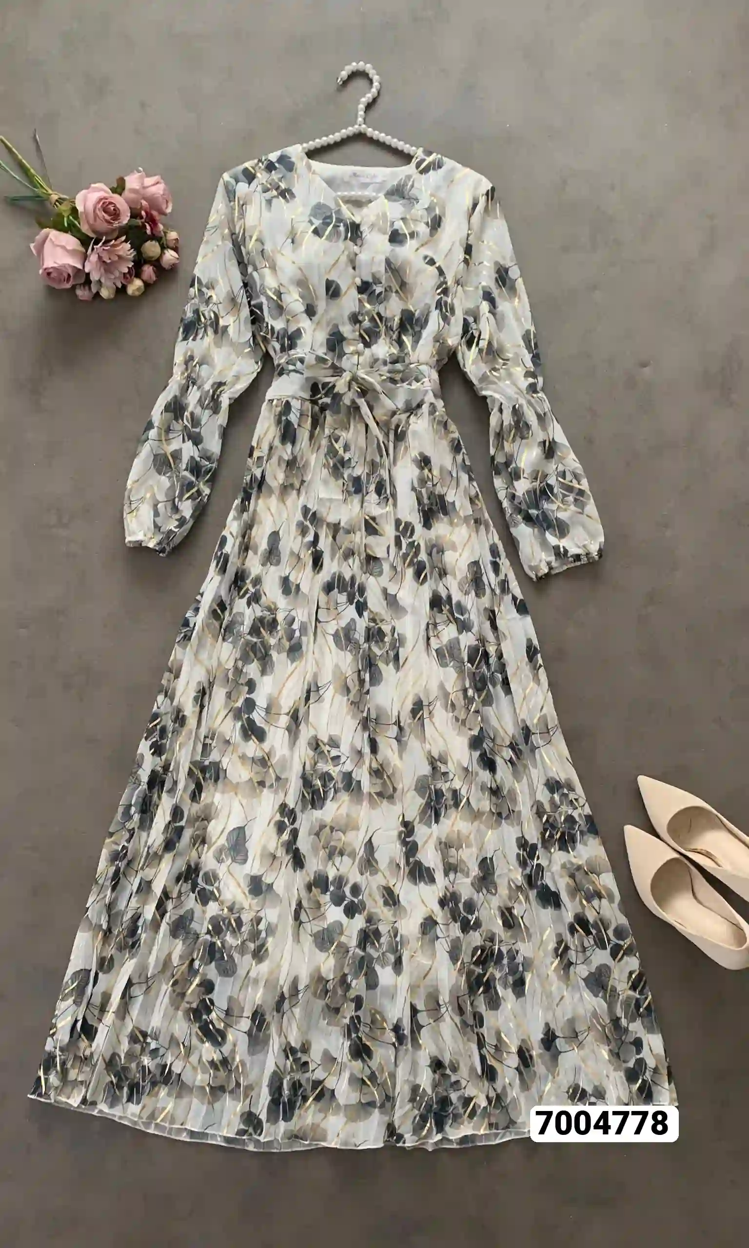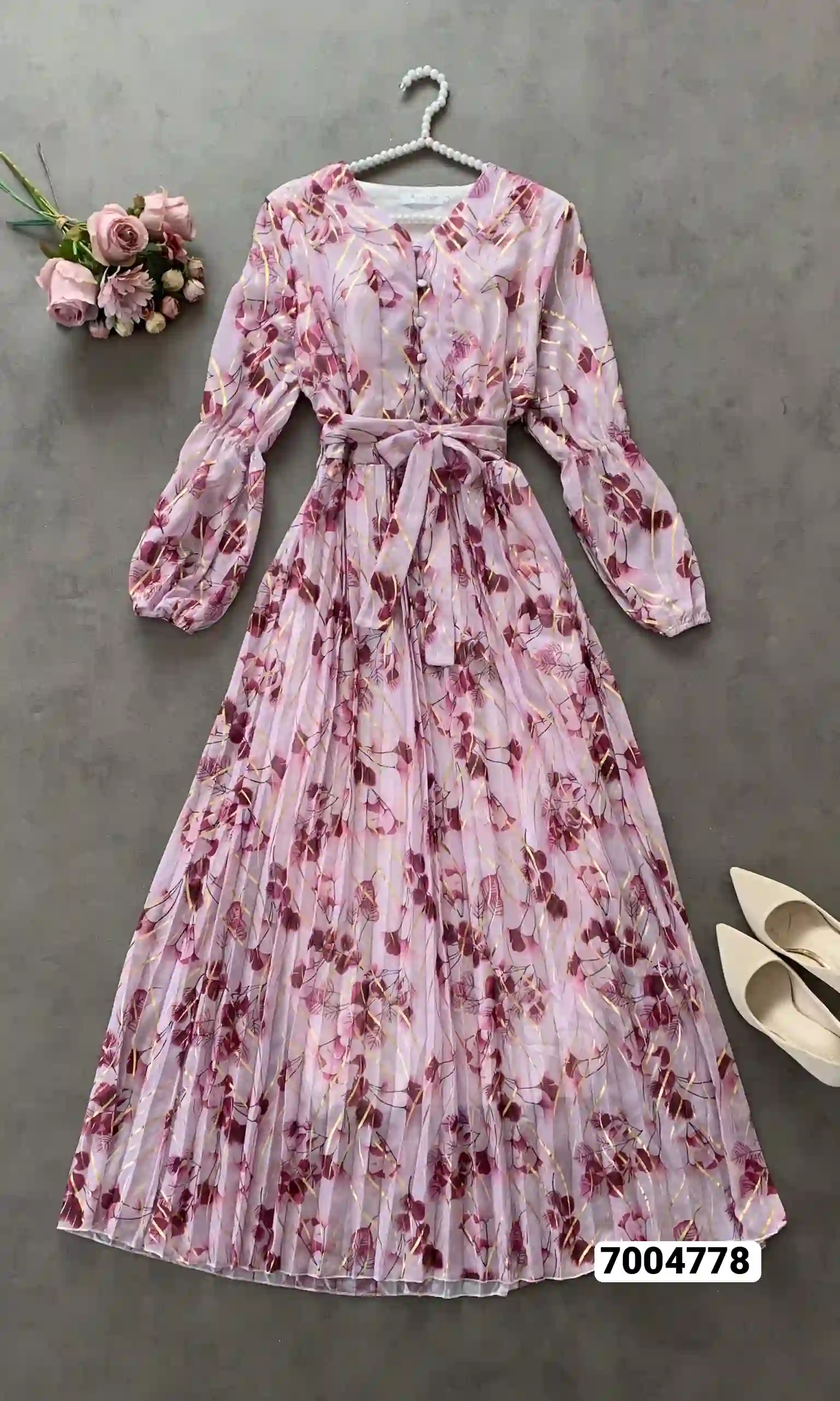فستان نسائي طويل كم شيفون ابو لمعة مبطن ربطة خصر ابو زرائر بالصدر كلوش