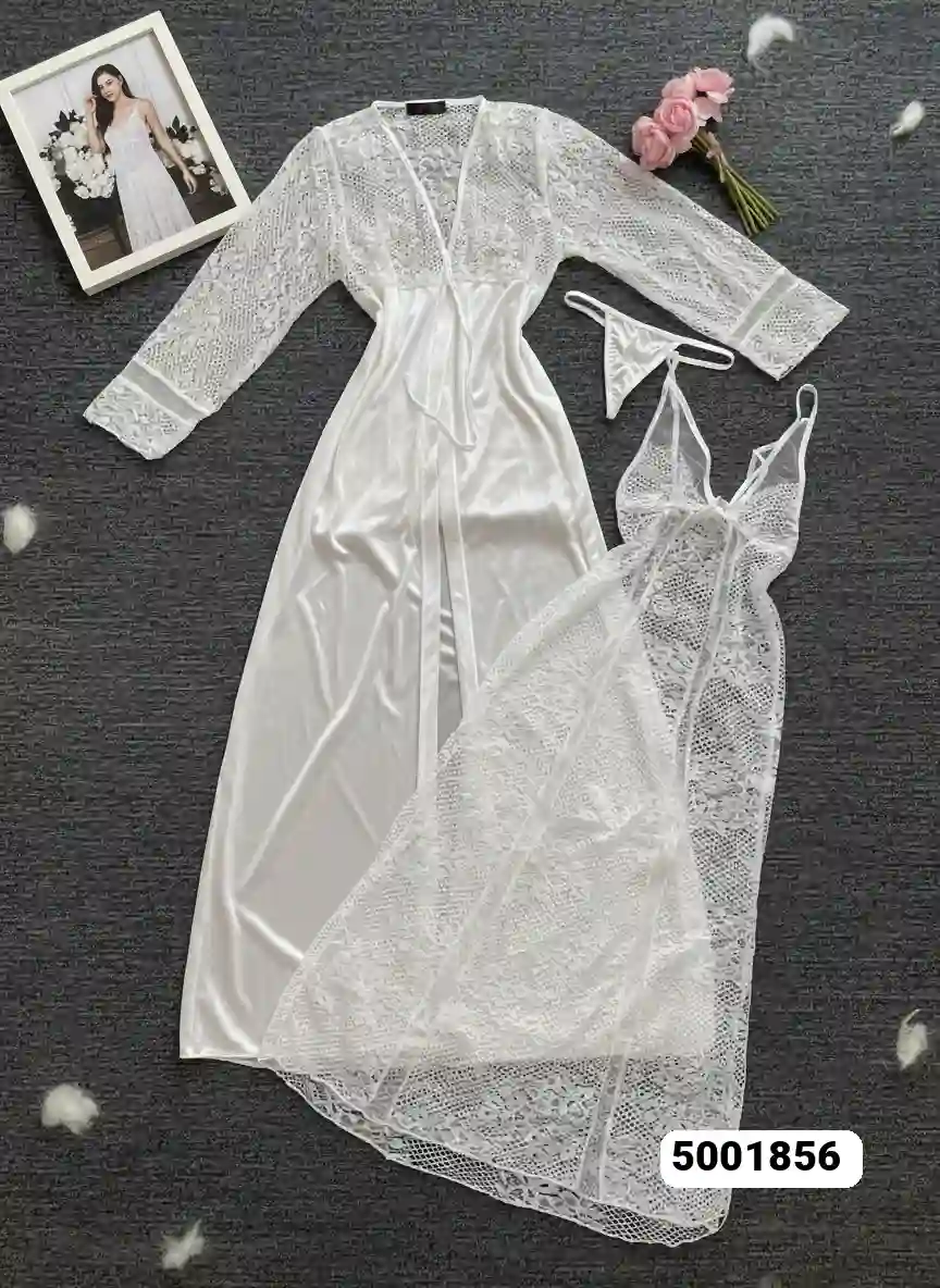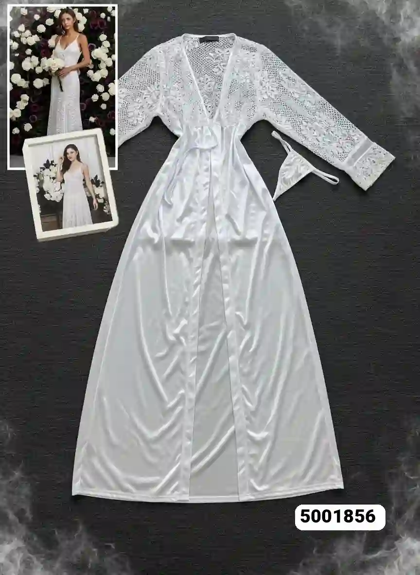 يتميز الروب بتصميم عملي وأنيق مع ياقة على شكل حرف V وتفاصيل دانتيل أنيقة على الأكمام والحافة السفلية. ينسدل الروب بخفة، **الميزات:** * **اللون:** أبيض نقي.وسكري *