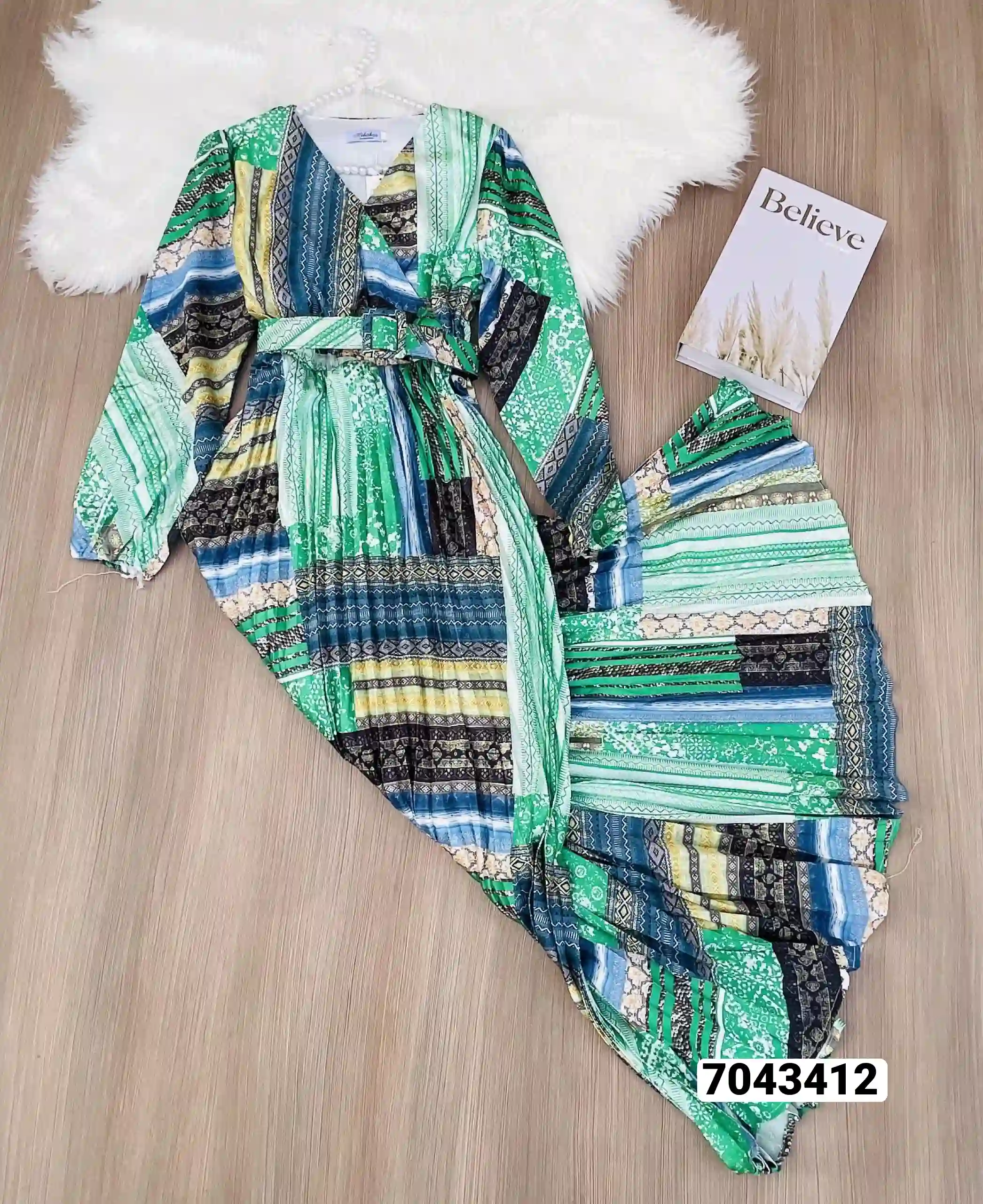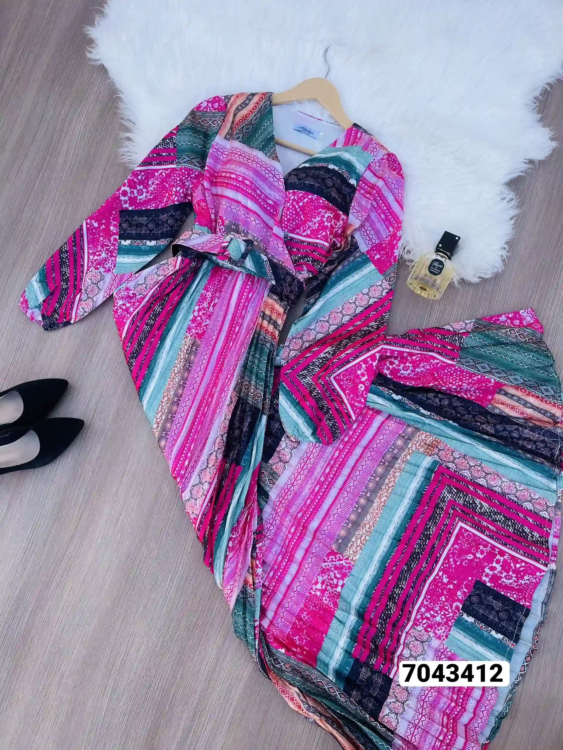 فستان نسائي حريرمكسر حزام قماش قطن65%وبلستر 35%