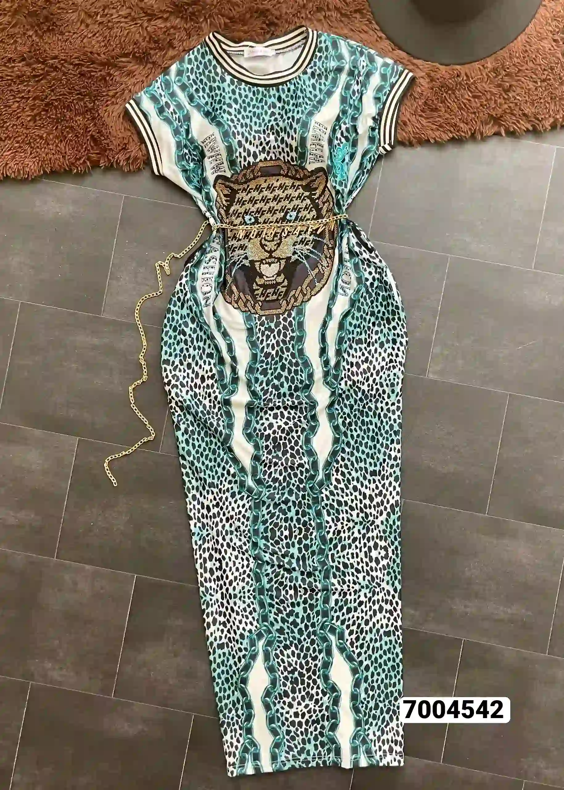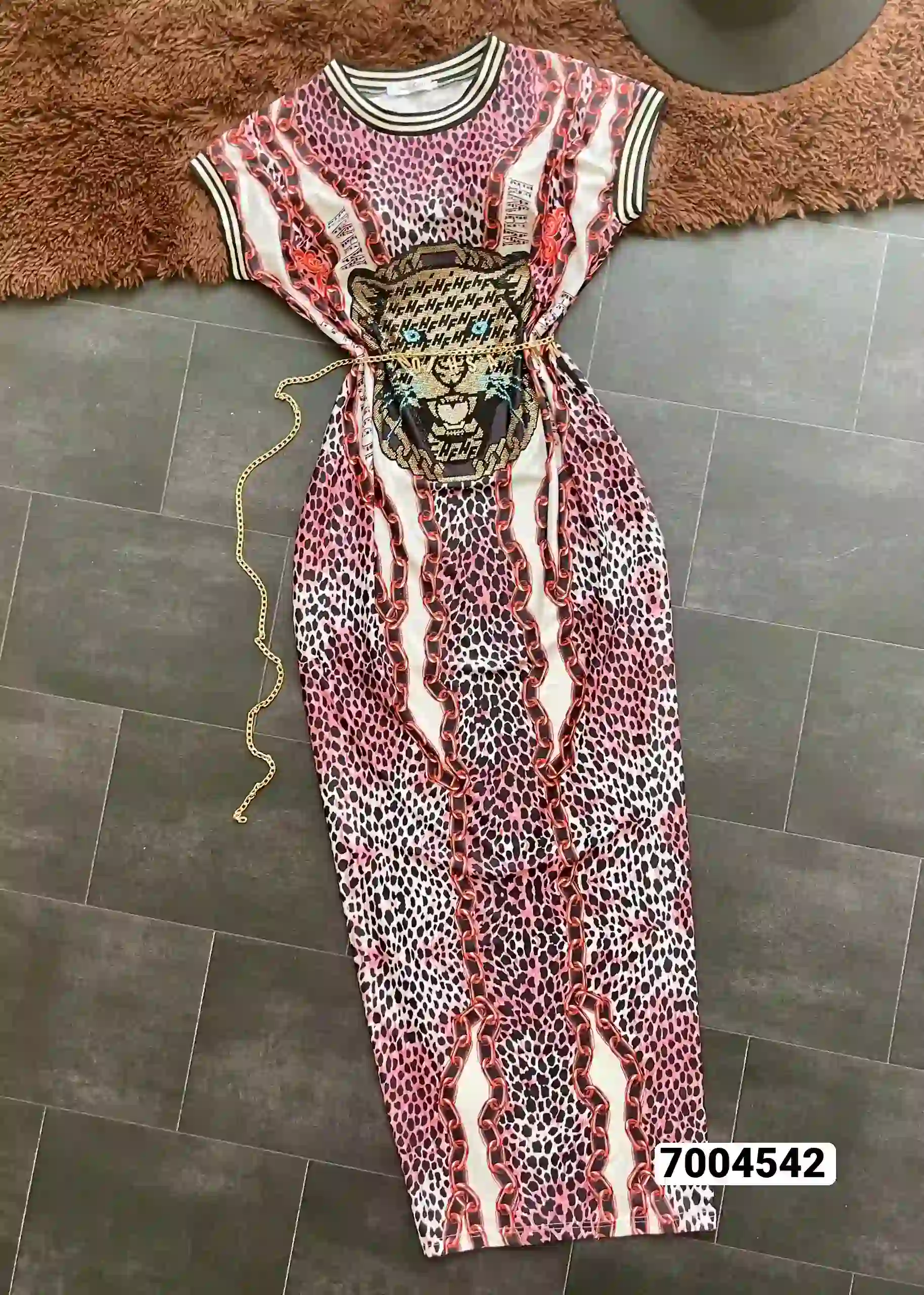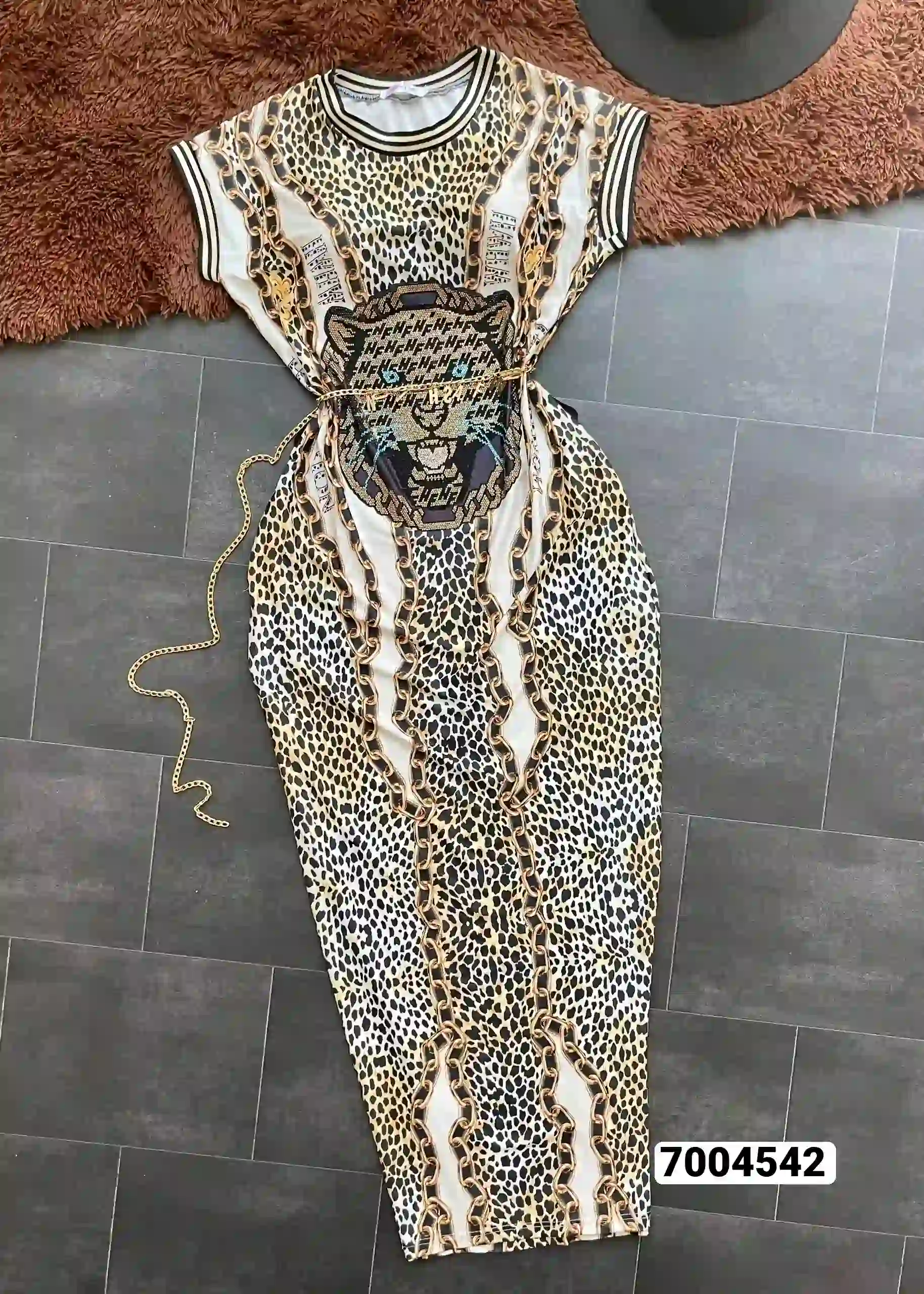 فستان نسائي استرتش نمري مفصص رسمة نمر مفتوح تحت ىبالجنب ابو حزام سلس