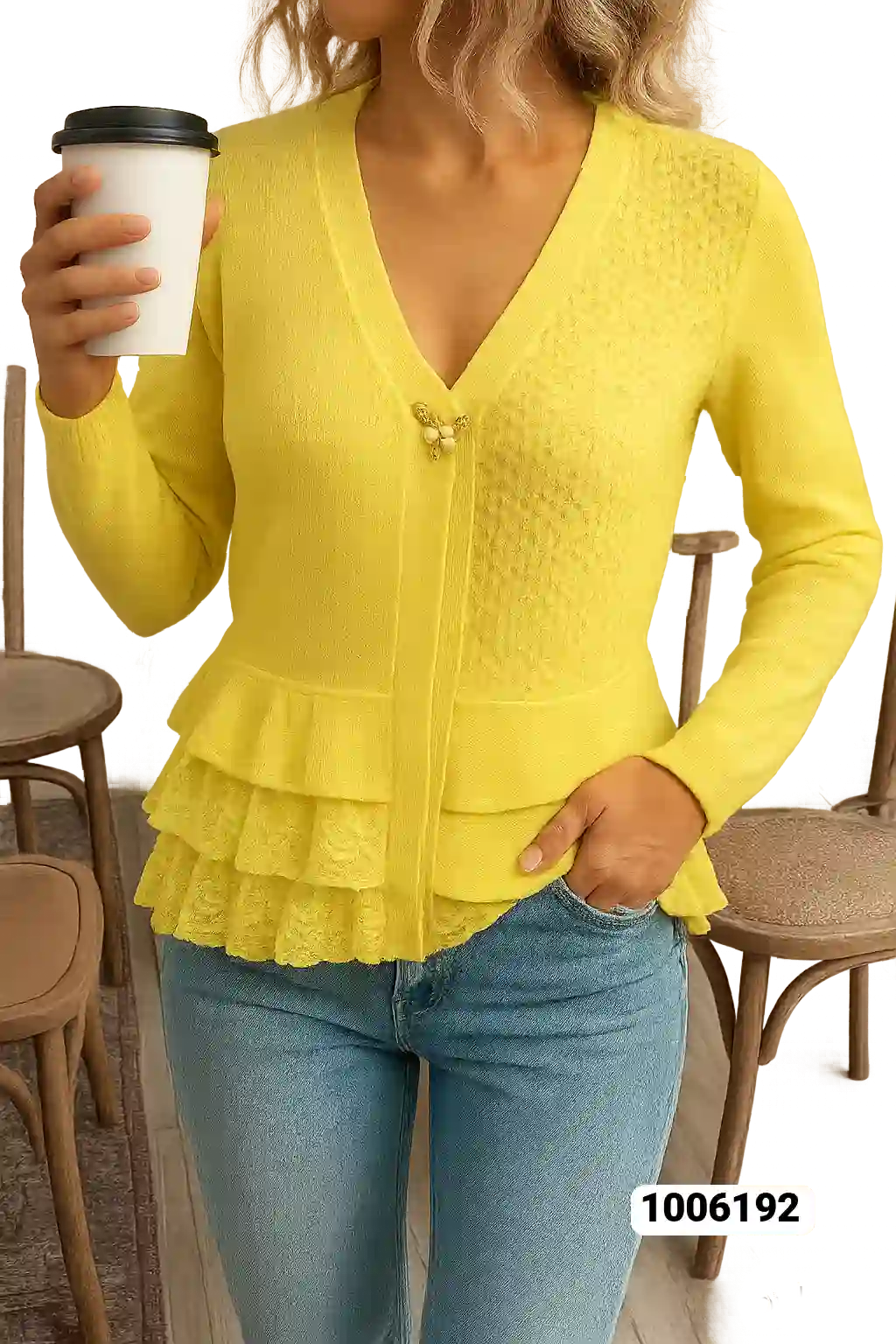 * **التصميم:** تصميم عصري بياقة على شكل V وأكمام طويلة.